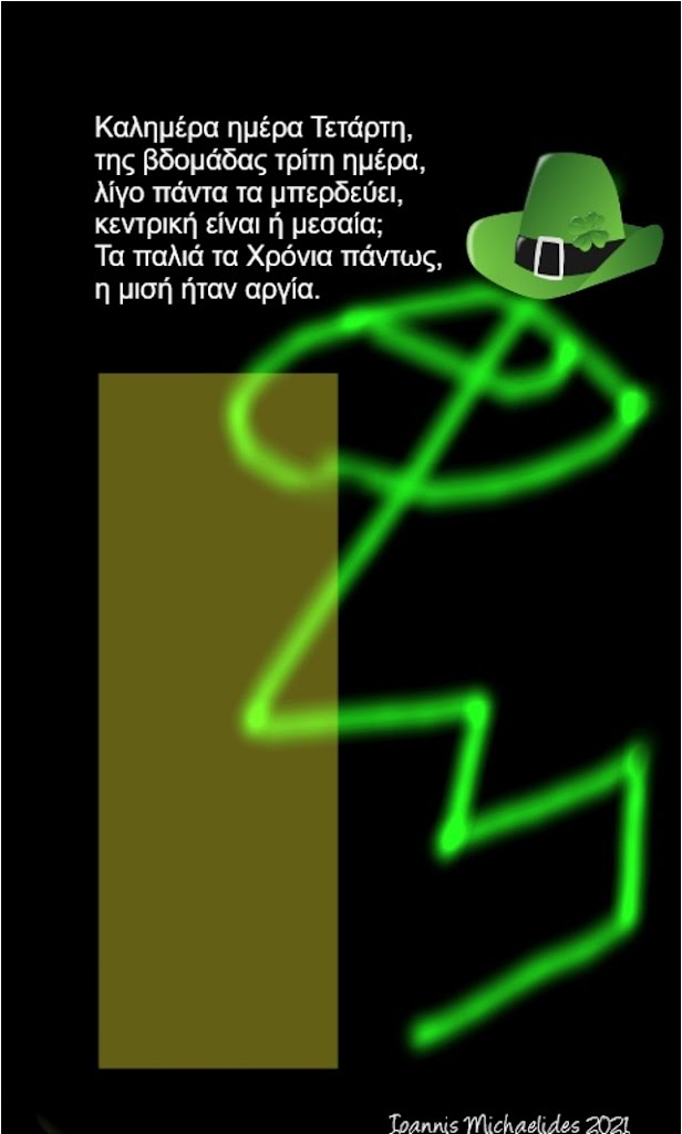 Allgemein Καλημέρα την Τετάρτη. von Ioannis Michaelides 2021 12 Januar, 2021 Administrator Καλημέρα ημέρα Τετάρτη, της βδομάδας τρίτη ημέρα, λίγο πάντα τα μπερδεύει, κεντρική είναι ή μεσαία; Τα παλιά τα Χρόνια πάντως, η μισή ήταν αργία. Ιωάννης Μιχαηλίδης Januar 2021