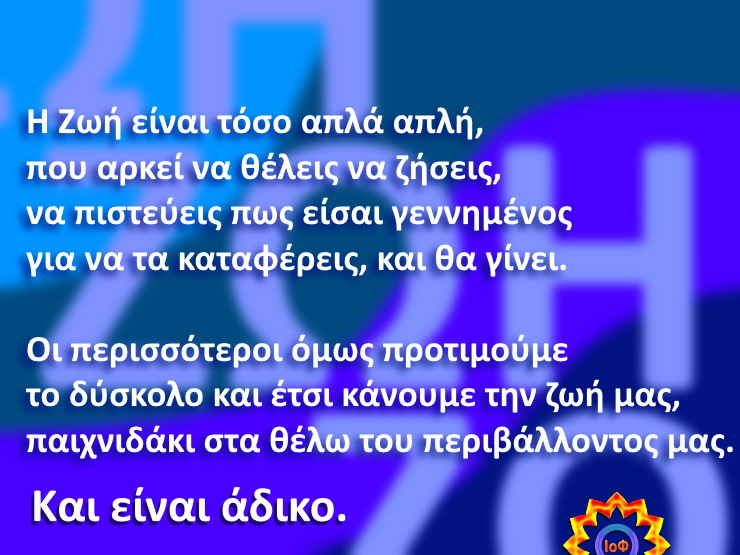 Η Ζωή είναι τόσο απλά απλή, που αρκεί να θέλεις να ζήσεις, να πιστεύεις πως είσαι γεννημένος για να τα καταφέρεις, και θα γίνει. Οι περισσότεροι όμως προτιμούμε το δύσκολο και έτσι κάνουμε την ζωή μας, παιχνιδάκι στα θέλω του περιβάλλοντος μας. Και είναι άδικο.