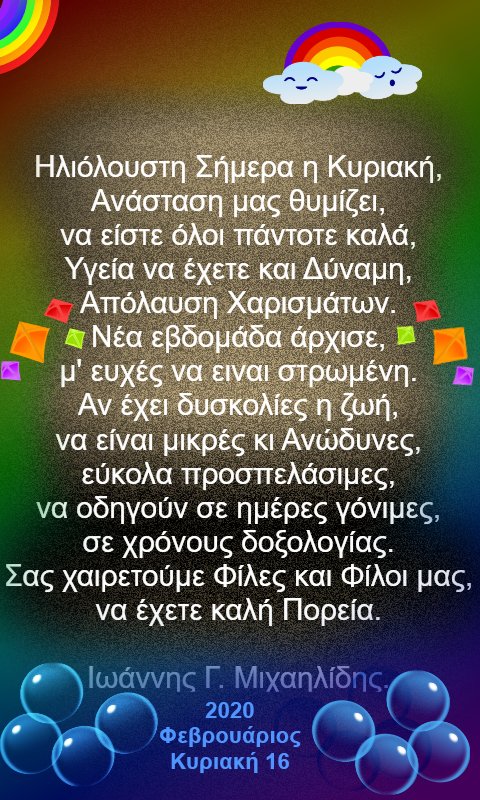 Πως Σήμερα είναι Κυριακή, δεν το ξεχνώ, φοράω τα καλά μου και με τον Ιησού Χριστό, που είναι στην Καρδιά μου, πηγαίνω στο σαλόνι μου, την Θεία Λειτουργία παρακολουθώ, στα εικονίσματα, στο καντήλι μου, στο θυμιατό και να βρεθώ πνευματικά στο Ουρανό, εφόσον Ο Κύριος μου και Θεός το επιτρέπει.