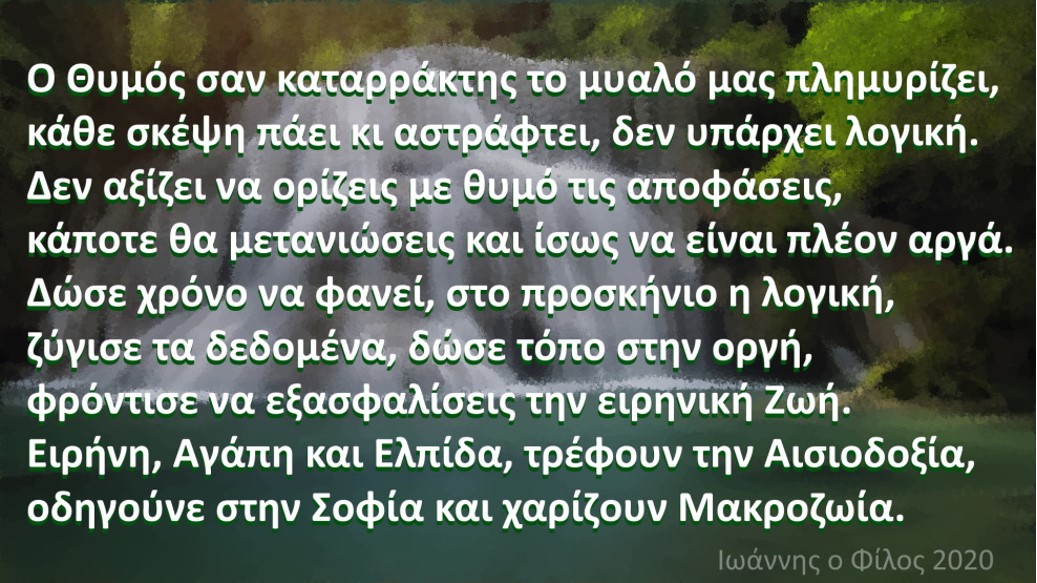 “Τον θυμό έχω στον Νου μου, που πολλούς τους κυριεύει, και εξορίζει κάθε σκέψη, για δημιουργική συνεργασία, των ανθρώπων, των κομμάτων, για ζωή πολιτισμένη, στην Πατρίδα των Ηρώων, της Θυσίας και της πνευματικής Αξίας”