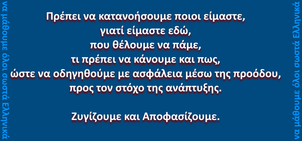 Πρέπει να κατανοήσουμε ποιοι είμαστε, γιατί είμαστε εδώ, που θέλουμε να πάμε, τι πρέπει να κάνουμε και πως, ώστε να οδηγηθούμε με ασφάλεια μέσω της προόδου, προς τον στόχο της ανάπτυξης.